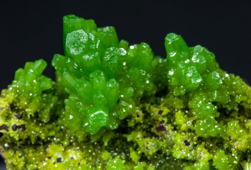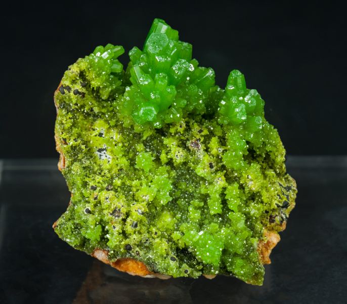 Group of Pyromorphite crystals with a prismatic habit and hexagonal outline, in matrix, with greater development in the upper part of the piece forming divergent crystal aggregates and flat terminations, with great luster and the best green color for specimens from the locality of origin, the Les Farges mine, in France.A very fine and elegant piece.
