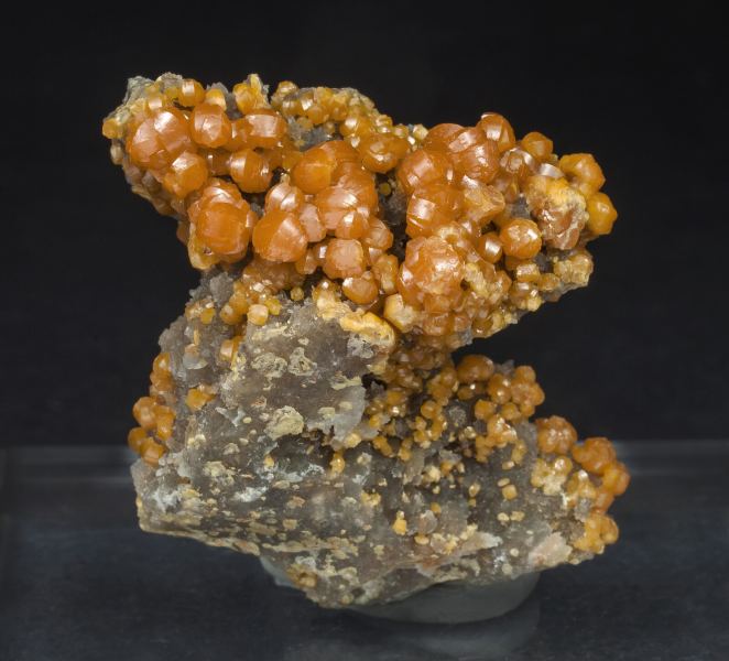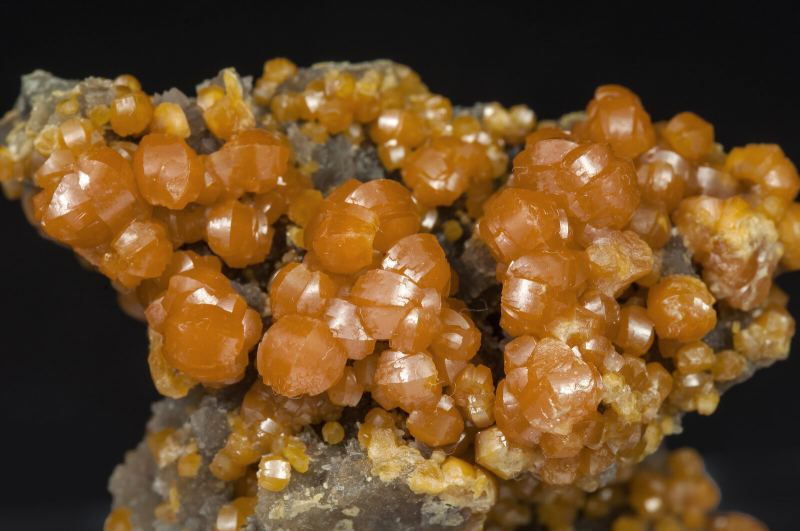 Pyromorphite crystals with a very unusual habit and color for Des Farges, with strong curvatures on the faces and edges, doubly terminated, with bright luster and an orange color. On a Baryte matrix.Les Farges Mine (Des Farges Mine), Ussel, Corrèze, Nouvelle-Aquitaine France