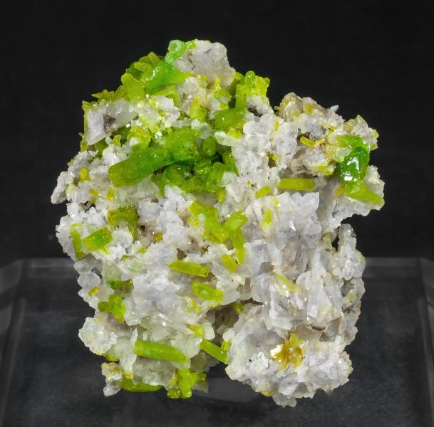 Elongated prismatic Pyromorphite crystals, many of them doubly terminated, translucent, with a good luster and very vivid green color. On a matrix of small white Quartz crystals.Les Farges Mine (Des Farges Mine), Ussel, Corrèze, Nouvelle-Aquitaine France
