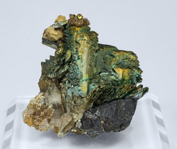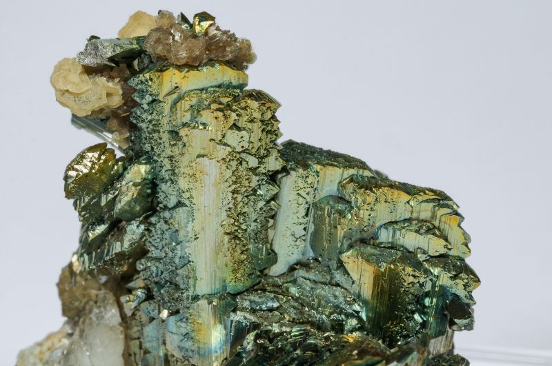 Parallel epitactic growths of Arsenopyrite-Marcasite crystals with very well defined and sharp crystal forms. Brilliant, with iridescence of various colors and on matrix. With Ferberite crystals, lenticular Siderite crystals and coatings of lamellar Muscovite crystals.Minas da Panasqueira, levels 0-1, Aldeia de São Francisco de Assis, Covilhã, Castelo Branco, Cova da Beira, Centro Portugal (2020)