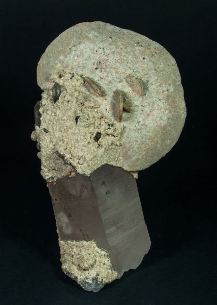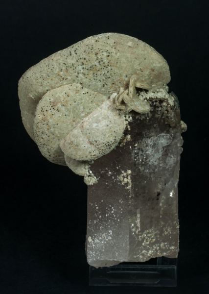 Very aerial group of lenticular Siderite crystals of considerable size, one of them clearly dominant and very aerial, light cream in color and implanted on a crystal of Quartz with inclusions of small Ferberite crystals.Minas da Panasqueira, levels 0-1, Aldeia de São Francisco de Assis, Covilhã, Castelo Branco, Cova da Beira, Centro Portugal (2021)