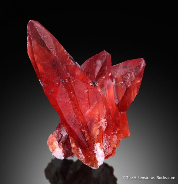 This is a Rhodochrosite with Manganite from N'Chwaning I Mine, KMF, Northern Cape, South Africa. This is a starkly geometric cluster of three elegant, gemmy, perfectly terminated crystals, with the largest measuring 3 cm in length.Data last checked on 29th Jul 2024 - specimen may no longer be available