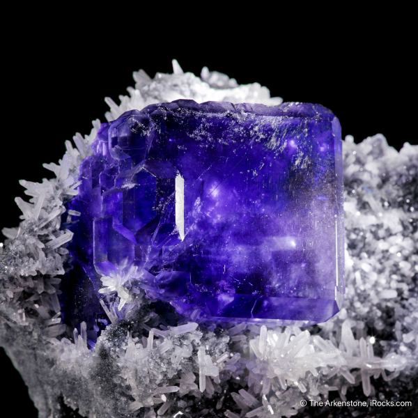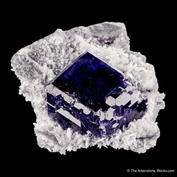 This is a Fluorite on Quartz from Xia Yang Mine, Xia Yang city, Yongchun Co., Quanzhou, Fujian, China. A shocking purple crystal, 3 x 2.7 x 2 cm, sits perched nicely on contrasting quartz matrix.Data last checked on 29th Jul 2024 - specimen may no longer be available