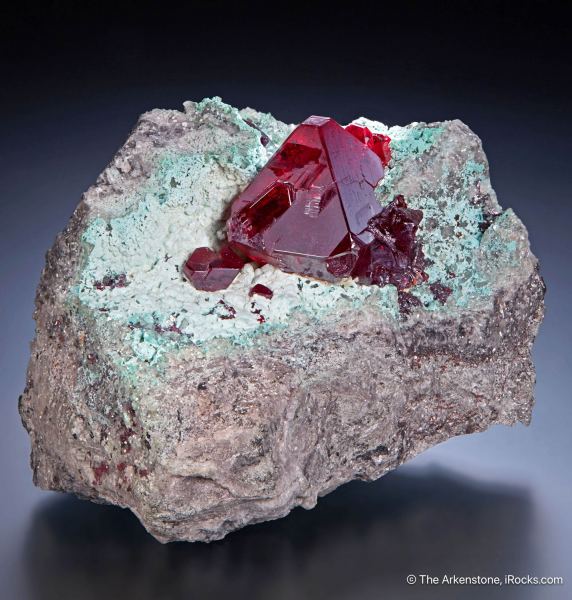Cuprite (gemmy red crystals) on Chrysocolla / Mashamba West Mine, Kolwezi mining district, Lualaba, DR Congo