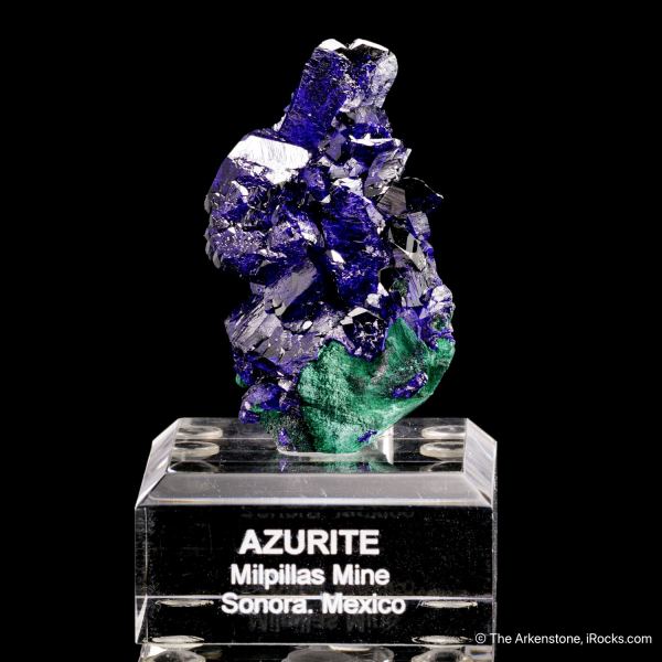 This is a Azurite and Malachite from Milpillas Mine, Santa Cruz Mun., Sonora, Mexico. This cluster of vivid blue azurites is from the later years of Milpillas, circa 2013-14, and features crystals with a bright and open color rising dramatically over a few blocky crystals of malachites (and they are themselves replacement of azurite).Data last checked on 26th Aug 2024 - specimen may no longer be available
