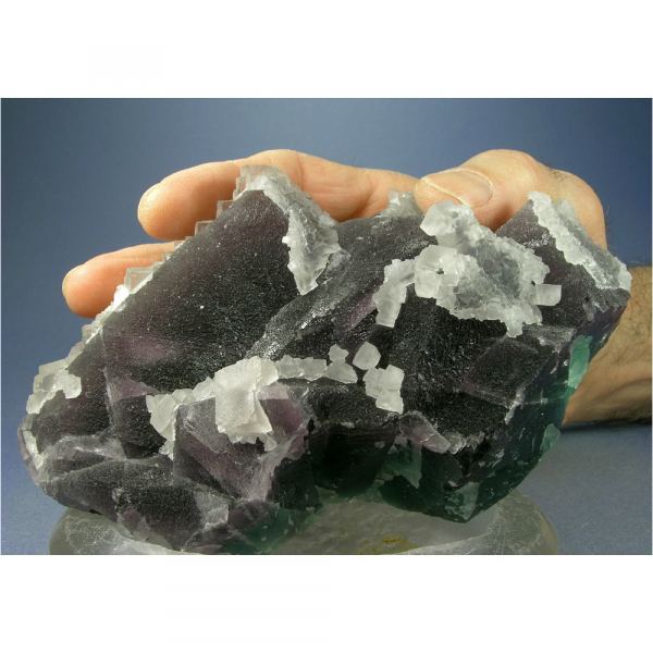 A large and very colorful specimen of Fluorite crystals from De'An in Jiangxi province, China. It features numerous sharply-terminated, green to purple Fluorite octahedrons interjoined to create the nicely balanced formation pictured. A second generation of colorless cubic Fluorite crystals is dusted along the top of the octahedrons as pictured. Backlight reveals the true beauty of this large cabinet-sized specimen: a rich green center with with a coating of deep purple above. Loads of fine details for you to explore all over. All in all, a very graceful and colorful composition, worthy of prominent placement in your mineral display cabinet.Data last checked on 2nd Apr 2024 - specimen may no longer be available