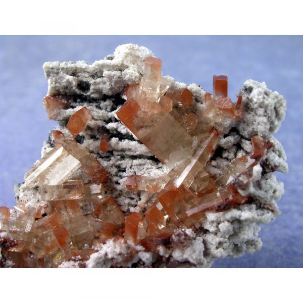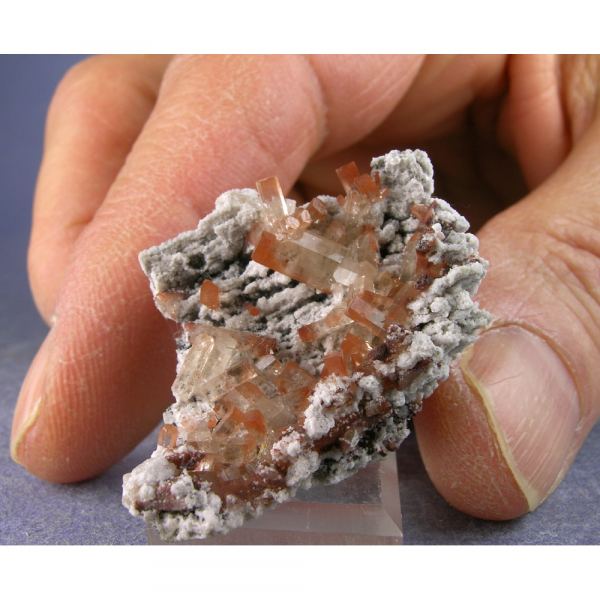 A small but very attractive specimen of GEMMY rich orange Topaz from Mexico. It features a group of beautiful reddish-orange Topaz crystals artfully positioned on a small gray Rhyolite matrix. The Topaz crystals are have countless tiny hairlike inclusiosn of Rutile. This specimen is from my personal collection.Data last checked on 2nd Apr 2024 - specimen may no longer be available