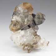 This is a Calcite from Elmwood Mine, Carthage, Smith Co., Tennessee, USA. Accented by a flowery growth of ivory colored barite is a huge, intensely cognac-colored, sparkling and gemmy, twinned and doubly terminated, calcite crystal.Data last checked on 29th Jul 2024 - specimen may no longer be available