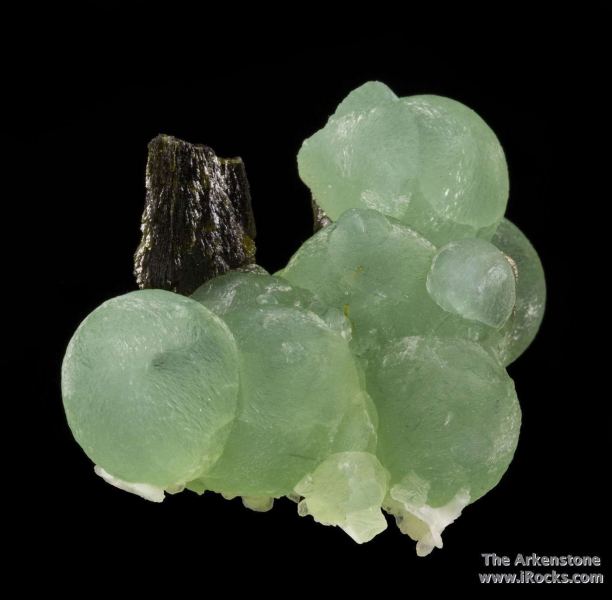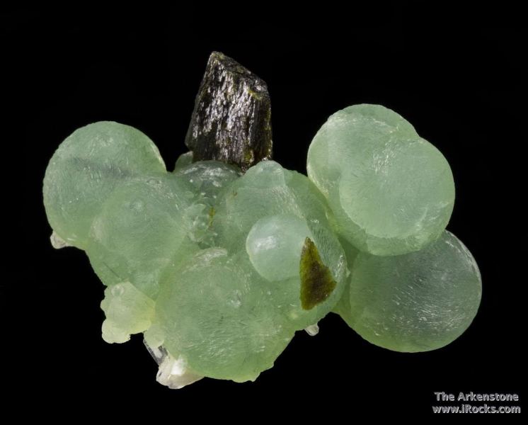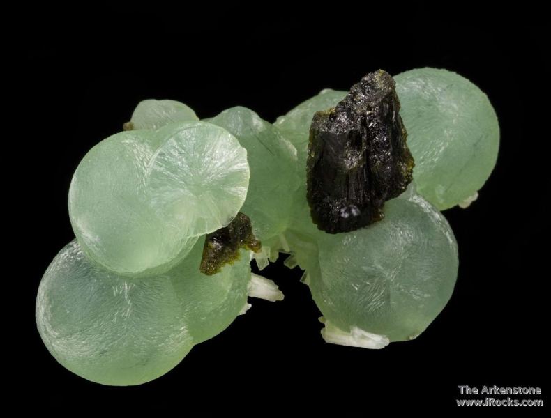 This is a Prehnite on Epidote with Laumontite from Diakon, Cercle de Boufalabe, Kayes Region, Mali. An unusual stacked cluster of 10, lustrous and translucent, apple green prehnite balls to 2 cm in length.Data last checked on 26th Aug 2024 - specimen may no longer be available
