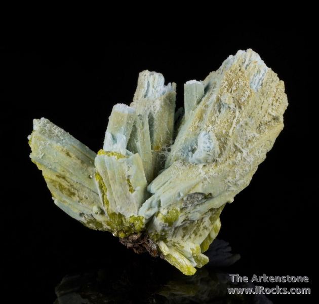 This is a Plumbogummite ps Pyromorphite from Yangshuo Mine, Yangshuo Co., Guilin Pref., Guangxi Zhuang, China. Stout, slightly diverging, sky blue crystals of plumbogummite to 5 cm in length clearly exhibit hoppered growth at their terminations.Data last checked on 26th Aug 2024 - specimen may no longer be available