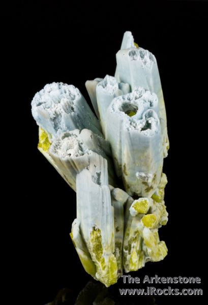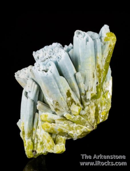 This is a Plumbogummite ps Pyromorphite from Yangshuo Mine, Yangshuo Co., Guilin Pref., Guangxi Zhuang, China. A cluster of vertically oriented, unusually sharp plumbogummite after pyromorphite crystals to 4 cm in length exhibits hopper growth at the terminations and a lovely color of light sky blue on the upper 2/3 of their length.Data last checked on 26th Aug 2024 - specimen may no longer be available