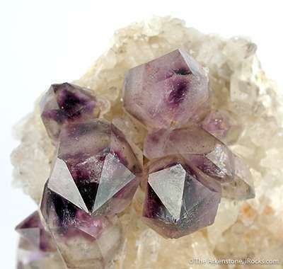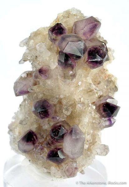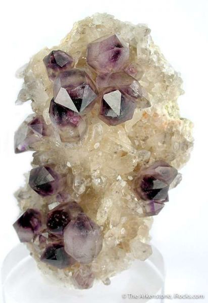 This is a Amethyst on Quartz from Orange River, Namibia. This matrix specimen features about a dozen rather equant, glassy amethyst crystals, to 2.5 cm across.Data last checked on 26th Aug 2024 - specimen may no longer be available