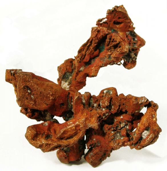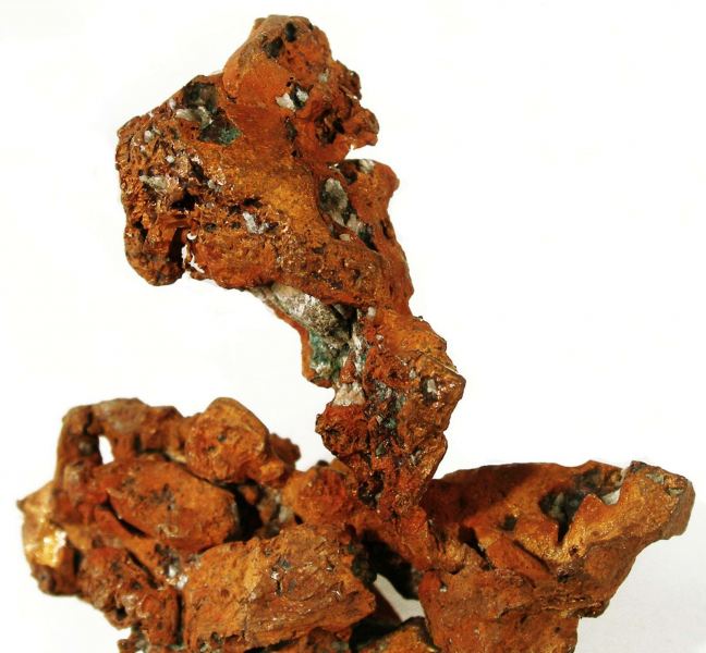 This is a Copper from Ojibway Mine, Keweenaw County, Michigan, USA. A specimen with dark copper color and good luster is crowned by an elongated cube measuring 1.5 cm in length that exhibits hopper growth.Data last checked on 26th Aug 2024 - specimen may no longer be available