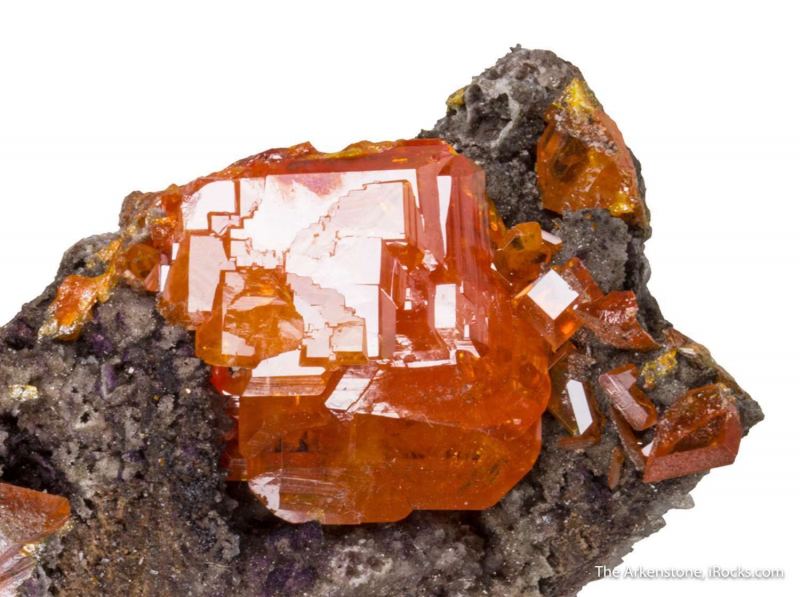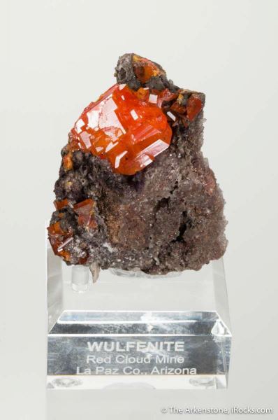 This is a Wulfenite from Red Cloud Mine, Silver District, Trigo Mts, La Paz County, Arizona, USA. A shockingly fat and juicy, geometrically fine crystal of wulfenite measuring 2.3 cm in length, surmounts a well trimmed matrix on this important small cabinet specimen.Data last checked on 26th Aug 2024 - specimen may no longer be available