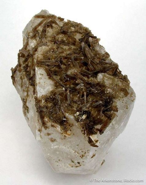 This is a Childrenite on Quartz from Poco Danta, Corrego Piaui, Taquaral, Minas Gerais, Brazil. Scattered all over one face of a colorless 10 cm long quartz crystal are translucent are numerous, bladed, lustrous, translucent, crystals of orangey-brown, childrenite.Data last checked on 26th Aug 2024 - specimen may no longer be available