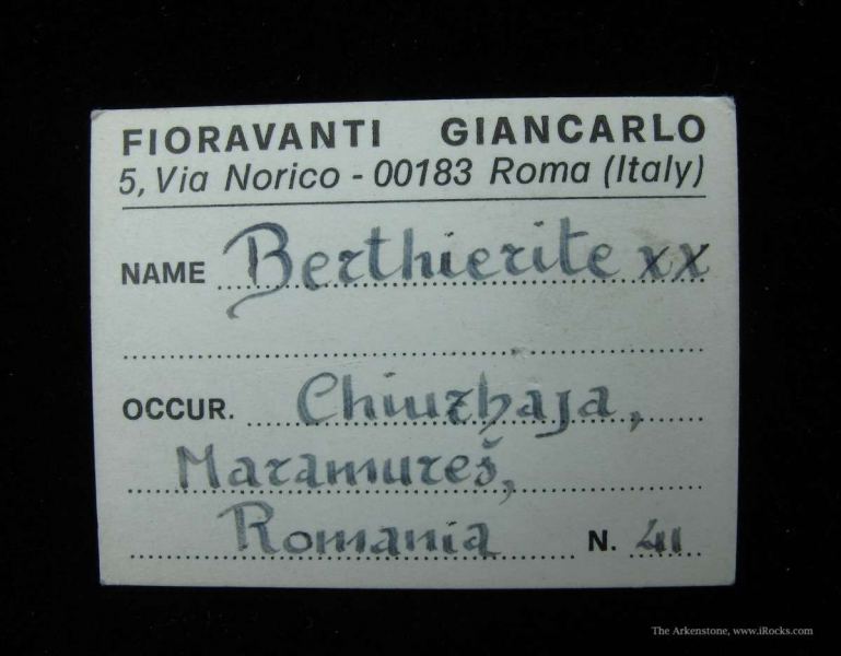 This is a Berthierite from Chiuzbaia, Baia Mare, Maramures Co., Romania. Choice spray of lovely, iridescent Berthierite, associated with Calcite and possibly Siderite.Data last checked on 26th Aug 2024 - specimen may no longer be available