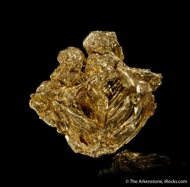 This is a Gold from Round Mountain, Nye Co, Nevada, USA. A sharp, incredibly bright, complex gold crystal consisting of a large hoppered octahedron with multiple smaller crystals of several different habits grown upon it.Data last checked on 26th Aug 2024 - specimen may no longer be available