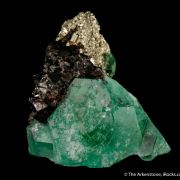 This is a Fluorite on Pyrite and Galena from Naica, Chihuahua, Mexico. A matrix of drusy pyrite and galena is nearly covered by frosted octahedrons of lustrous and translucent, pastel green fluorite, to 2.5 cm across.Data last checked on 26th Aug 2024 - specimen may no longer be available