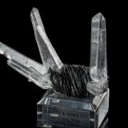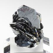 This is a Hematite Rose on Adularia from Lucendro, Gotthard, Switzerland. Perched aesthetically atop a drusy adularia (feldspar) matrix is a starkly standing, lustrous, black hematite rose, measuring 1.3 cm across, There are also a few, tiny spheres of light pink stilbite present as well.Data last checked on 26th Aug 2024 - specimen may no longer be available