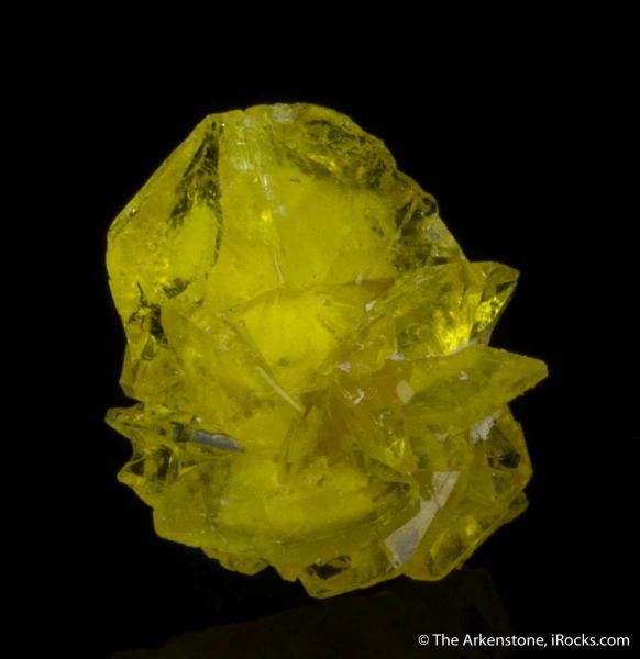 This is a Jouravskite from N'Chwaning III Mine, Kuruman, Kalahari MN field, Northern Cape Province, South Africa. On a sliver of ingrown matrix, this piece is a floater rosette of glassy and gemmy, lemon-yellow jouravskite crystals, to 9 mm across.Data last checked on 26th Aug 2024 - specimen may no longer be available
