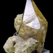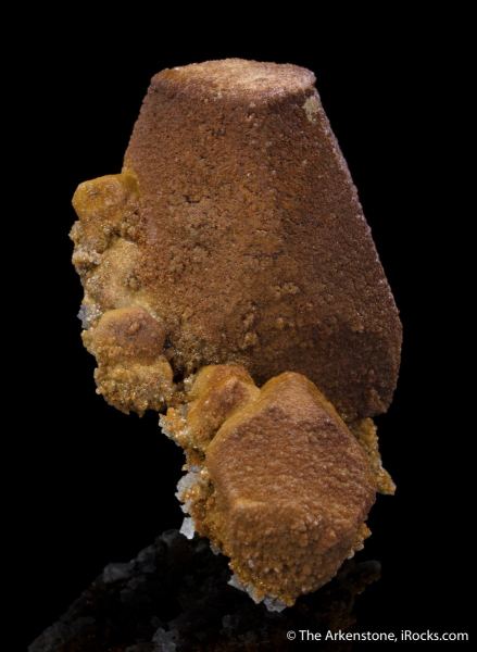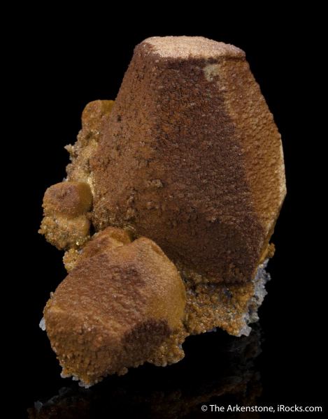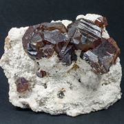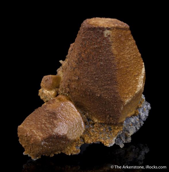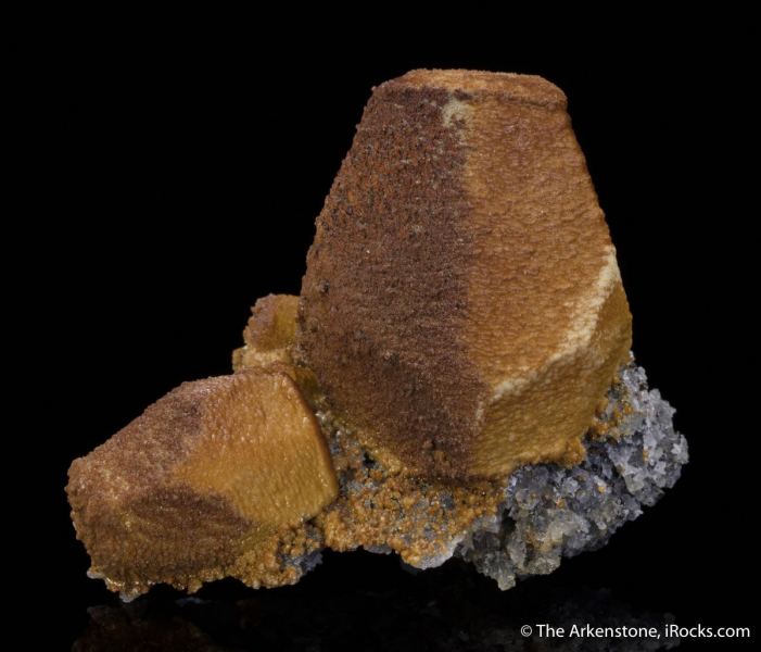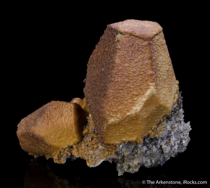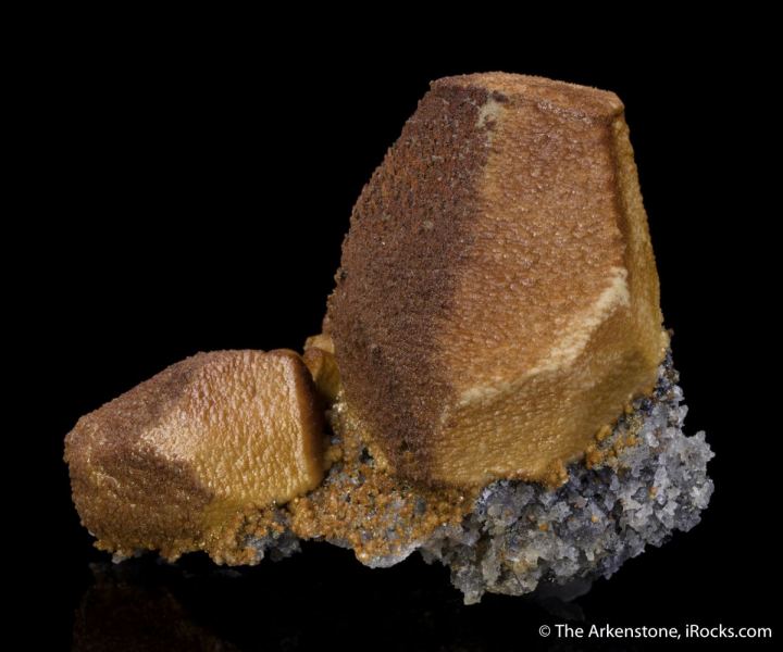 This is a Siderite, Sphalerite cast after Calcite from Aggenys Mine, North Cape Province, South Africa. Nicely perched on a drusy calcite matrix are two, scalenohedral epimorphs of siderite after calcite.Data last checked on 29th Jul 2024 - specimen may no longer be available