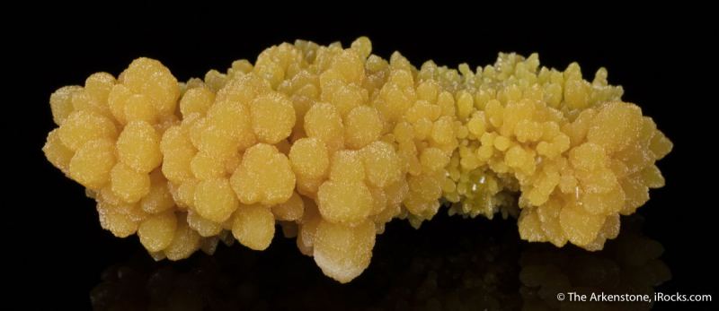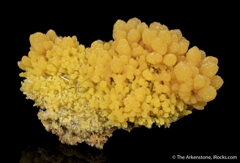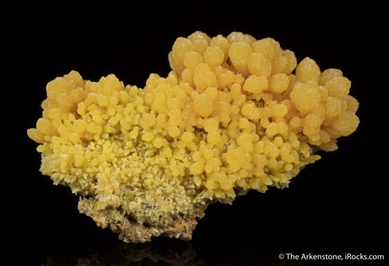This is a Mimetite from Ojuela Mine, Mapimi, Durango, Mexico. An attractive small cabinet piece almost entirely covered in sparkly, slightly elongate botryoids of mimetite on a sliver of barely perceptible gossan matrix.Data last checked on 29th Jul 2024 - specimen may no longer be available