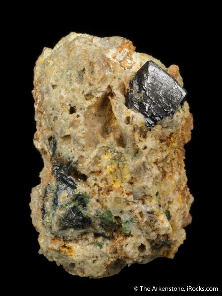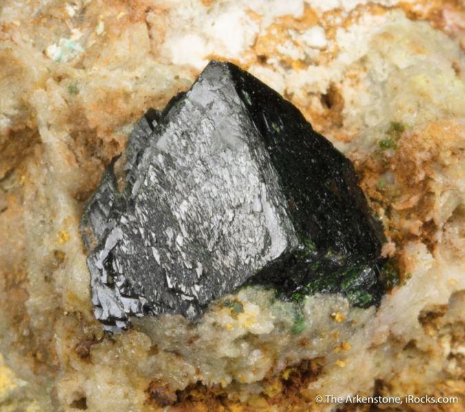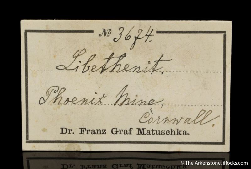 This is a Libethenite from Phoenix United Mine, Linkinhorne, Liskeard, Cornwall, England, UK. An unusually sharp, textbook-shaped, large and well-developed libethenite crystal on a vuggy quartz matrix from this old 1800s locality.