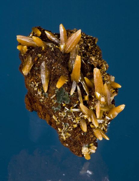 This is a Wulfenite from Ojuela Mine, Mapimi, Durango, Mexico. Emplaced on ocherous limonite is a striking pincushion cluster of lustrous and translucent, elongated, bi-pyramidal, amber, wulfenite crystals, to 2.0 cm in length.Data last checked on 29th Jul 2024 - specimen may no longer be available