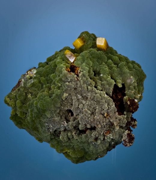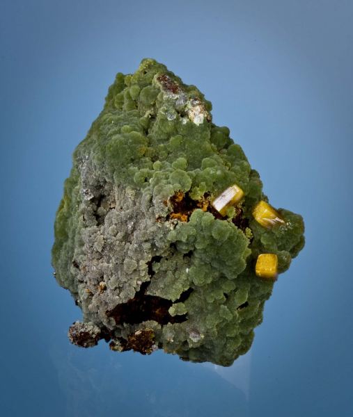This is a Mimetite With Wulfenite from Ojuela Mine, Mapimi, Durango, Mexico. A thin but 3-dimensional crust of silky, rich green mimetite, to .6 cm across, completely covers a core of ocherous limonite.Data last checked on 29th Jul 2024 - specimen may no longer be available