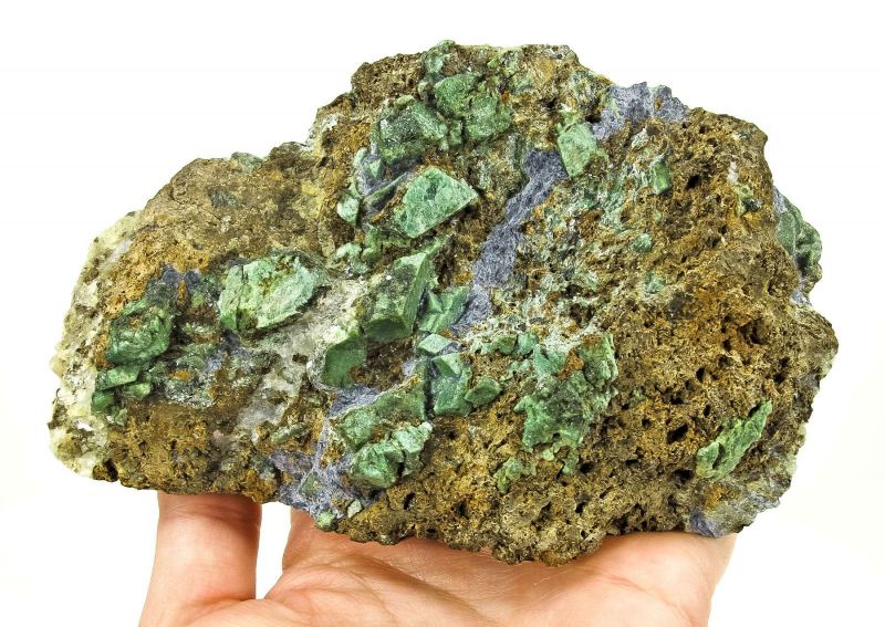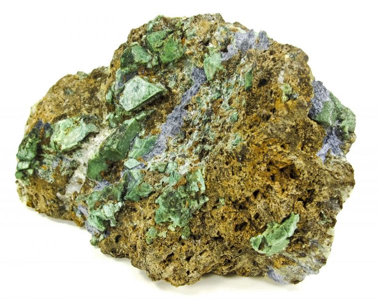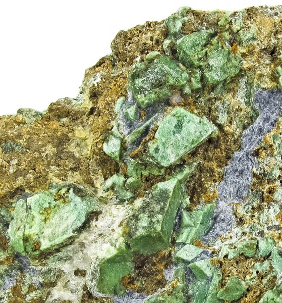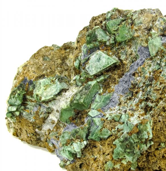 This is a Lawsonite Var. Chromian from Cape Marmari, Grammata Bay, Syros Island, Greece. A remarkable new find from the Tucson 2012 show, of green lawsonite crystals (the color induced by chromium), in contrasting matrix with thin veins of purple actinolite and white muscovite.These are lustrous, deep green crystals to 2 cm across, of chromium-rich lawsonite, which is a very uncommon silicate found in good crystals at only a few locales wordlwide.Data last checked on 29th Jul 2024 - specimen may no longer be available