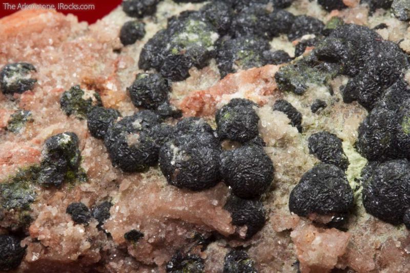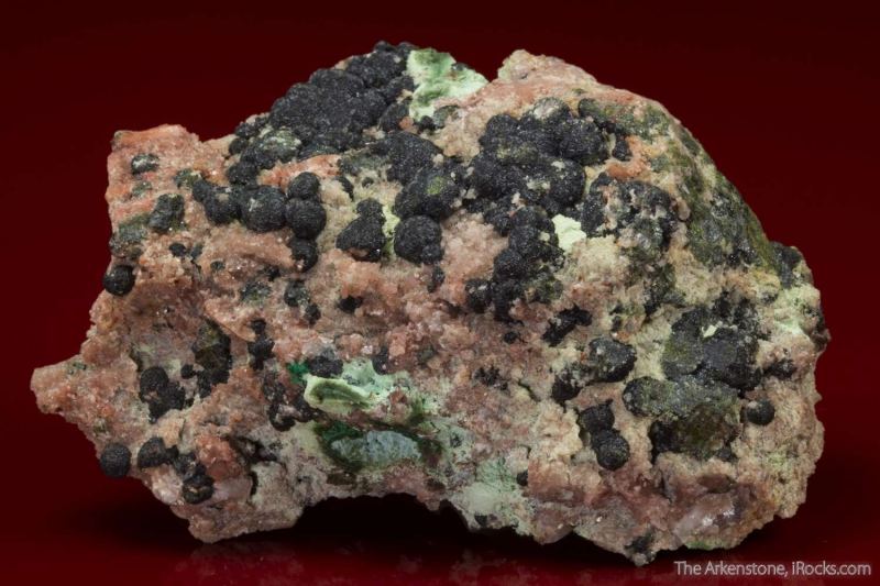 This is a Vesignieite from Mashamba West mine, Kolwezi district, Katanga Copper Crescent, Katanga (Shaba), Democratic Republic of Congo. Dark green botryoids and botryoidal aggregates of vesignieite from 1.5mm to 1.5cm are distributed on a fine-grained, flesh-colored carbonate matrix with light green copper secondary minerals.Data last checked on 29th Jul 2024 - specimen may no longer be available