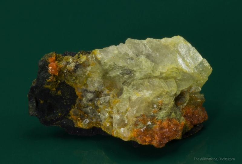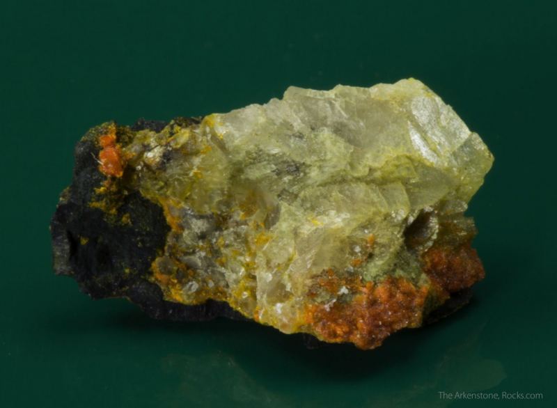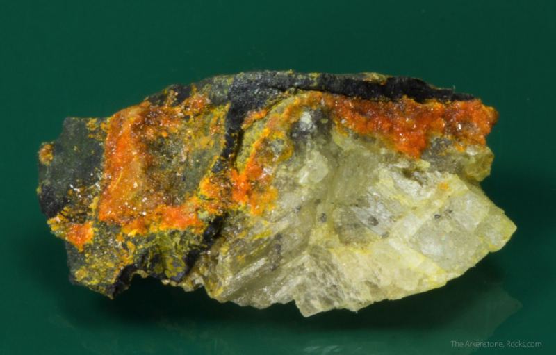 This is a Huemulite and Pascoite from H14F Uranium mine #21 (Shaft #21 mine), Pribram-Haje, Central Bohemia, Czech Republic. Yellow-orange huemulite and orange-red pascoite form a crust along a veinlet of white calcite.Data last checked on 29th Jul 2024 - specimen may no longer be available