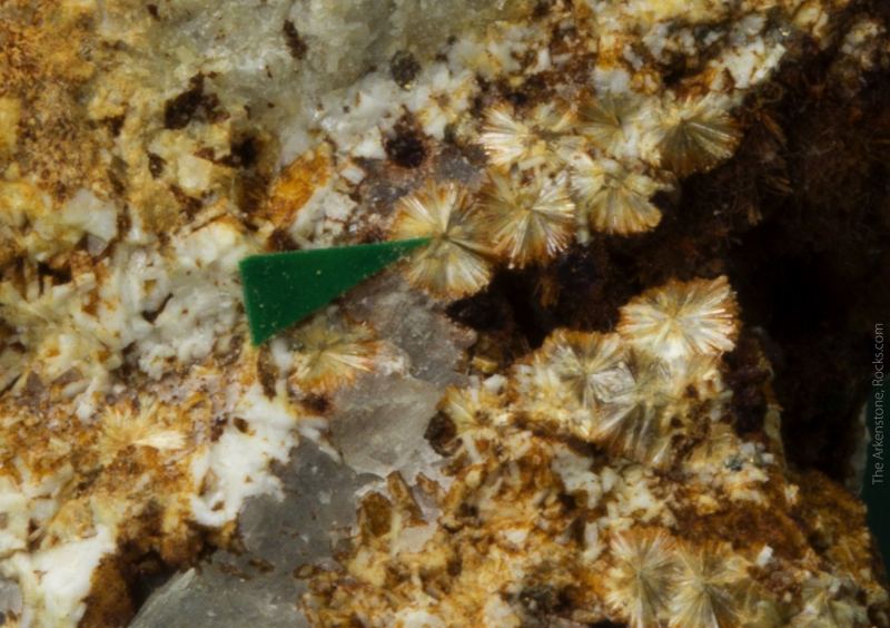 Monteregianite-(Y) (type locality) with Pectolite on Albite