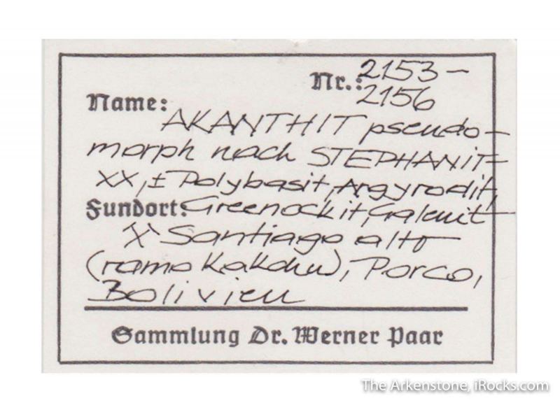 This is a Acanthite ps Stephanite with Polybasite and Argyrodite from Santiago mine, Porco, Agua de Castilla, Antonio Quijarro Province, Potosi Department, Bolivia. A peculiar Bolivian sulfide/sulfosalt pseudomorph!Data last checked on 29th Jul 2024 - specimen may no longer be available