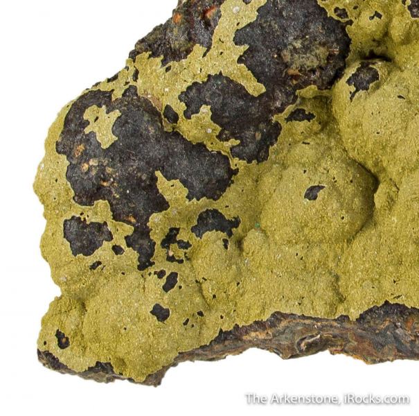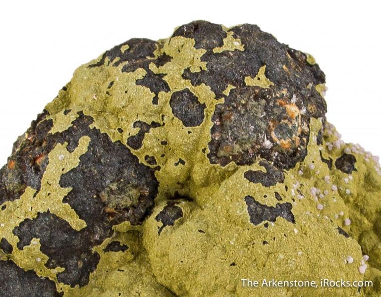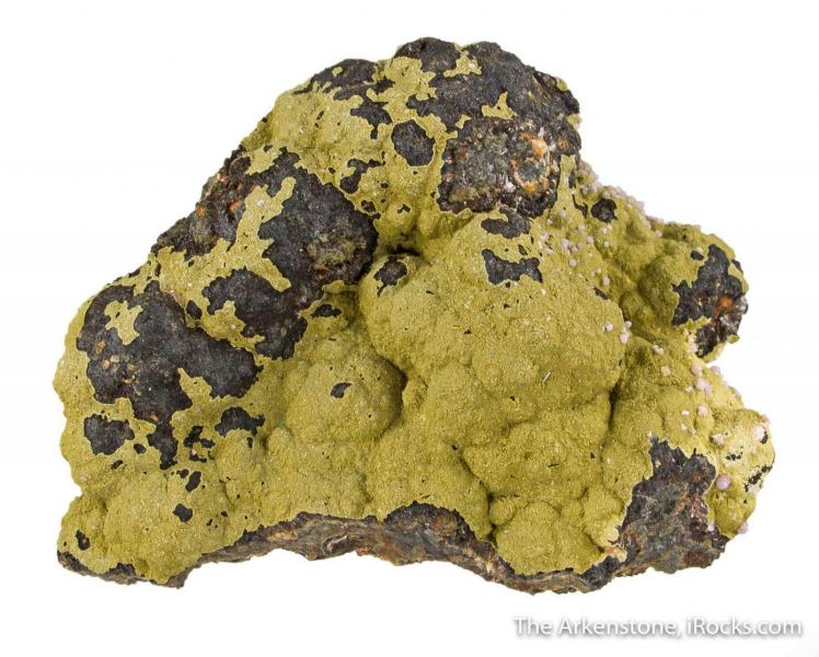 This is a Kidwellite with Strengite on Beraunite from 3 Oak Gap, near Mina, Polk Co., Arkansas, USA. A mounded surface of beraunite and possibly dufrenite and rockbridgeite is covered with a vibrant olive green coating of kidwellite, a rare hydrated sodium iron phosphate hydroxide, which is augmented by 1mm, spheres of pale pink to lavender strengite, especially on one side of the piece.Data last checked on 29th Jul 2024 - specimen may no longer be available