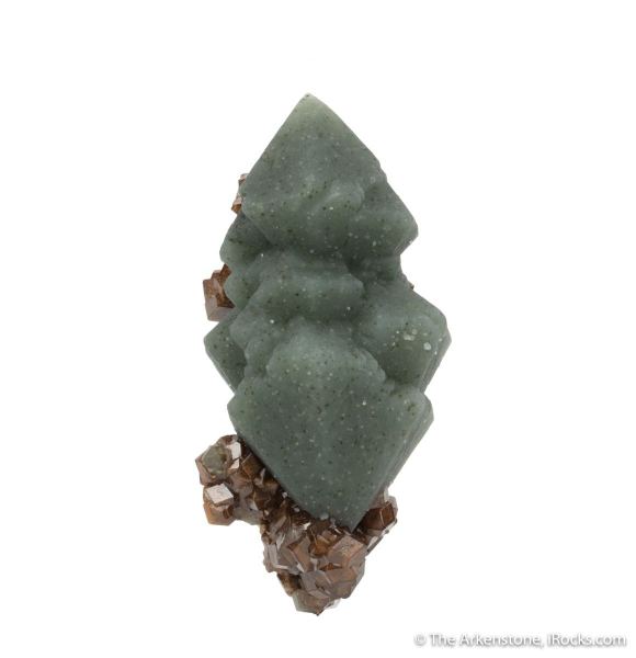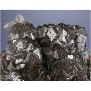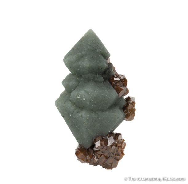 This is a Quartz with Hedenbergite Inclusions and Andradite Garnet from Huanggang Mine, Hexigten Banner, Inner Mongolia, China. Short, green Quartz crystals lacking prism faces are stacked in parallel growth are embellished with numerous brownish Andradite Garnet crystals.Data last checked on 29th Jul 2024 - specimen may no longer be available