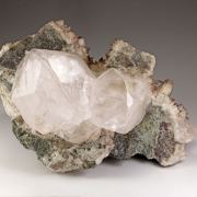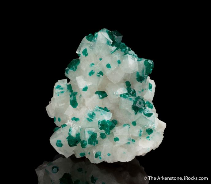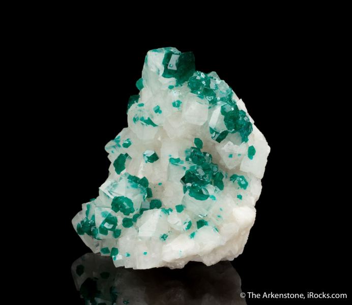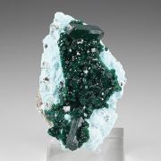 This is a Dioptase on and included within Calcite from Tsumeb Mine, Tsumeb, Oshikoto Region, Namibia. This is a stunning small cabinet specimen of the revered emerald-green Dioptase crystals gracing numerous gemmy rhombs of white Calcite from Tsumeb!Data last checked on 29th Jul 2024 - specimen may no longer be available