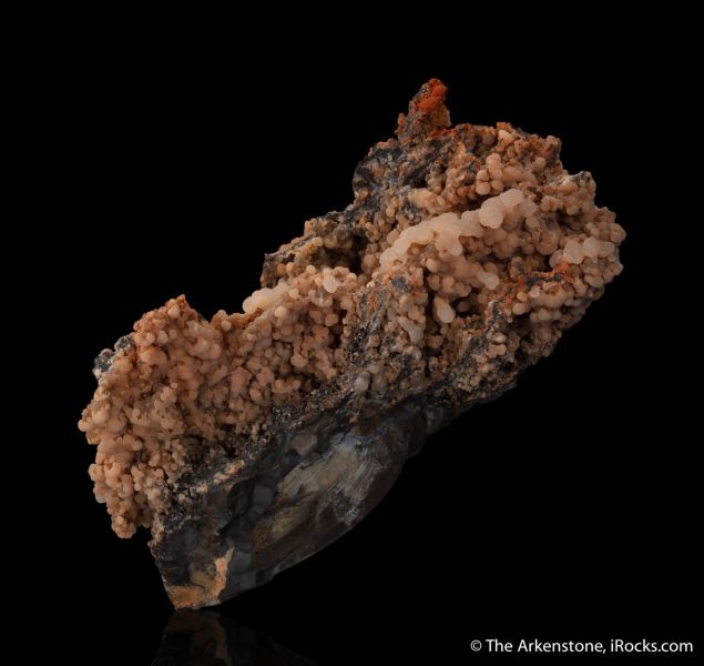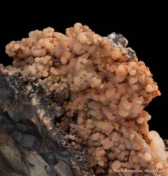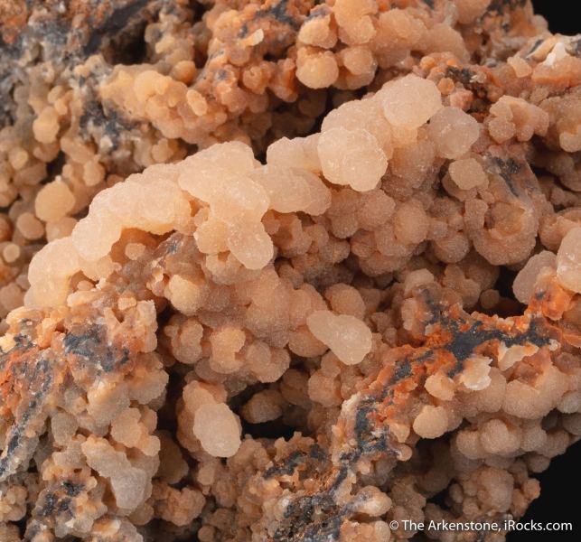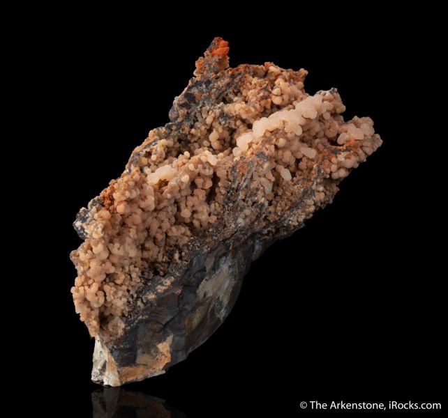 This is a Bultfonteinite from N'Chwaning Mines, Kuruman, Kalahari manganese field, Northern Cape, South Africa. We usually see Bultfonteinite as small, divergent sprays of white crystals, rarely as large showy CABINET pieces like this, with sparkling aggregates of translucent pale peach-pink spheres.Data last checked on 29th Jul 2024 - specimen may no longer be available