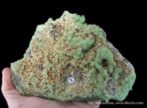 This is a Smithsonite Var. Cuprian from Tsumeb Mine, Tsumeb, Otjikoto Region, Namibia. What can you say about a 17 cm plate that is completely covered on one side by jillions of lustrous, mint green 1 mm Cuprian Smithsonites that look like fresh green snow?Data last checked on 29th Jul 2024 - specimen may no longer be available