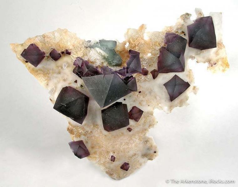 This is a Fluorite on Quartz from De'An, Wushan, Jiangxi Province, China. A beautiful large specimen with multihued purpley-green octohedra to 3.5 cm on edge, perched in a quarrtz matrix plate.Data last checked on 29th Jul 2024 - specimen may no longer be available