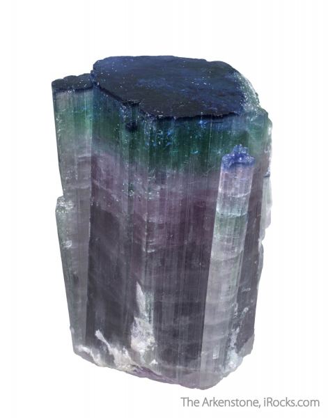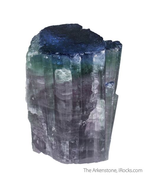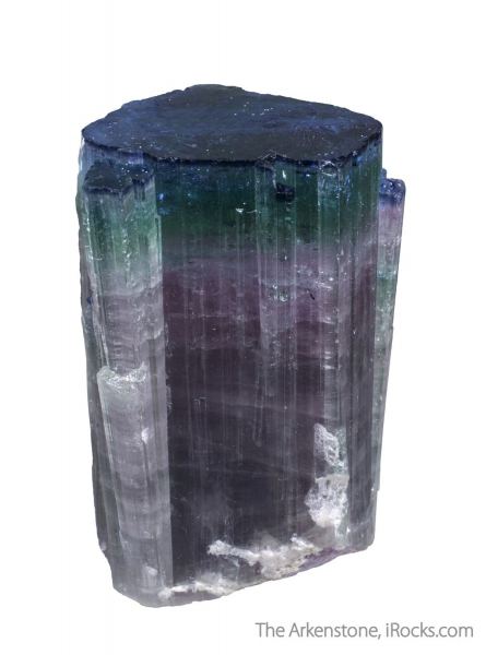 This is a Elbaite Tourmaline from Mawi Pegmatite, Nuristan, Laghman Province, Afghanistan. This highly unusual example of a "bluecap" elbaite crystal from Afghanistan exibits a range of lovely colors starting with a 1 mm thick shiny bluecap termination, grading downward to a 4 mm thick light sky blue layer, then to an 8 mm thick bright apple green, and finally to a pinkish purple through the lower 2/3 of the crystal.Data last checked on 29th Jul 2024 - specimen may no longer be available