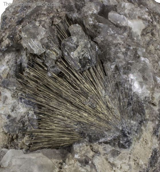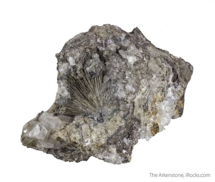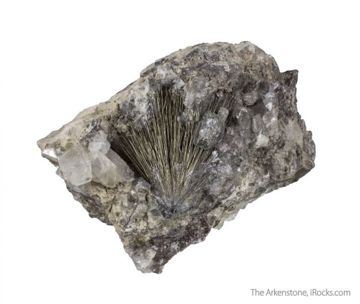 This is a Millerite from Estabrook Park occurrence, Milwaukee, Wisconsin, USA. Nestled aesthetically in a limestone vug with colorless calcite rhombs, to 5 mm across, is a diverging spray of acicular, lustrous, brassy colored milllerite crystals measuring 2 cm in length.Data last checked on 29th Jul 2024 - specimen may no longer be available