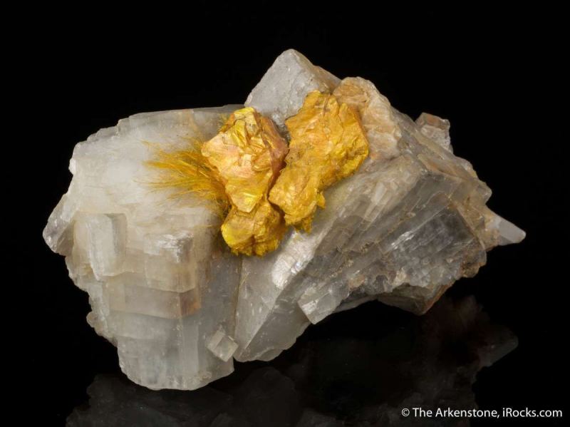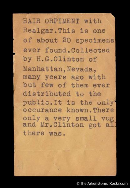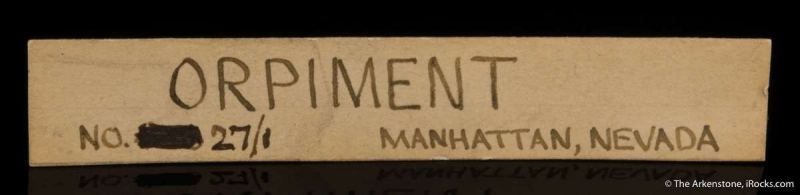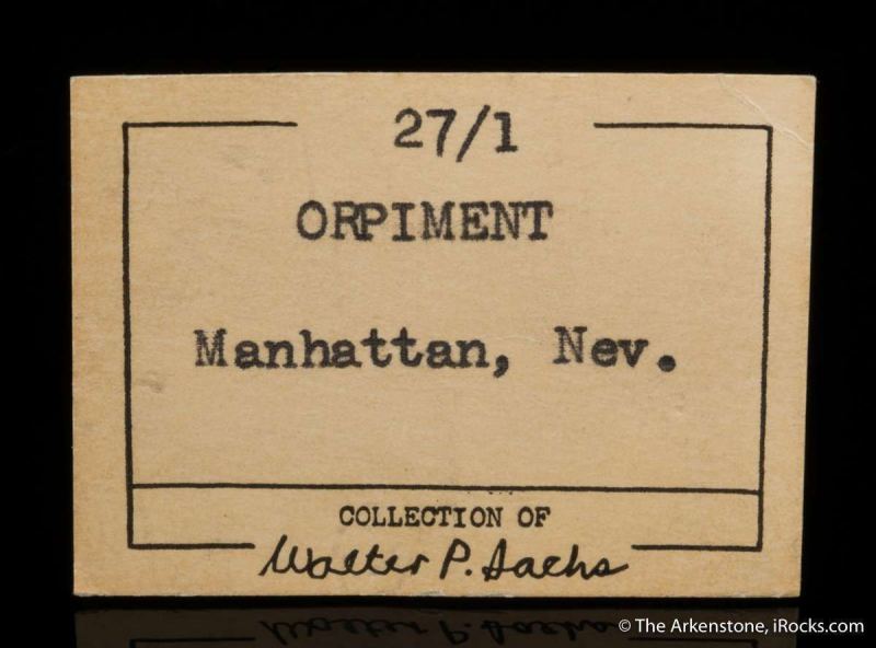 This is a Wakabayashilite on Calcite from White Caps Mine, Manhattan, Toquima Range, Nye Co., Nevada, USA. This is one of the most rare and strange of old USA mineral species, not found since the early 1900s here, and almost legendary among collectors of such old and esoteric minerals.Data last checked on 29th Jul 2024 - specimen may no longer be available