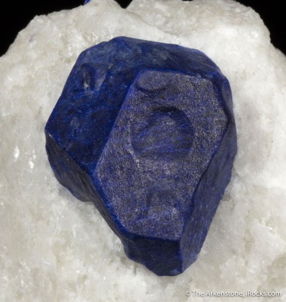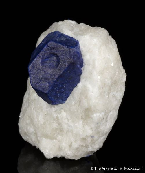 This is a Lazurite from Sar-E-Sang, Badakhshan Province, Afghanistan. Perched aesthetically on snow white marble is a single, doubly terminated, matte lustered lazurite crystal, measuring 2.2 cm in length.Data last checked on 29th Jul 2024 - specimen may no longer be available