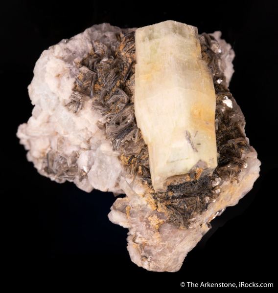 This is a Milarite with Muscovite and Albite from Jaguaracu Pegmatite, Jaguaracu, Minas Gerais, Brazil. A stout, well-formed, yellow, hexagonal prismatic crystal of Milarite is neatly perched on a matrix of Muscovite and Albite.Data last checked on 29th Jul 2024 - specimen may no longer be available