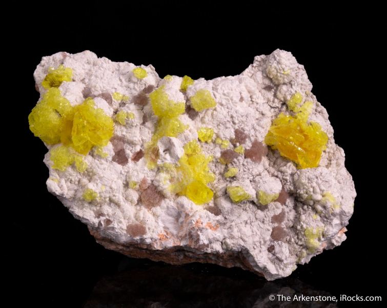 This is a Jouravskite with Xonotlite on Oyelite from N'Chwaning III Mine, Kuruman, Kalahari, Northern Cape, South Africa. Bright canary-yellow crystals of Jouravskite and sprays of pink Oyelite grace a blanket of white Xonotlite, for exceptional contrast!Data last checked on 29th Jul 2024 - specimen may no longer be available