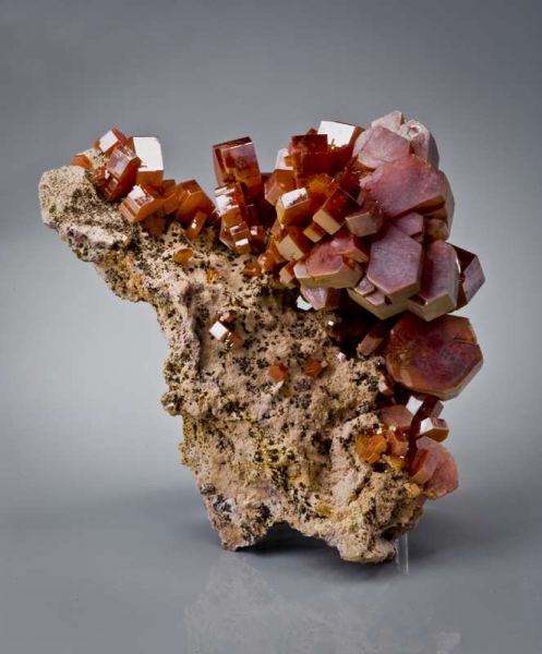This is a Vanadinite from Mibladen, Morocco. Aesthetically perched high on its contrasting matrix, is a flower-like spray of intergrown, doubly terminated, lustrous and translucent, brick-red vanadinite crystals, to 1.5 cm in length.Data last checked on 29th Jul 2024 - specimen may no longer be available