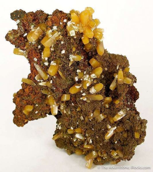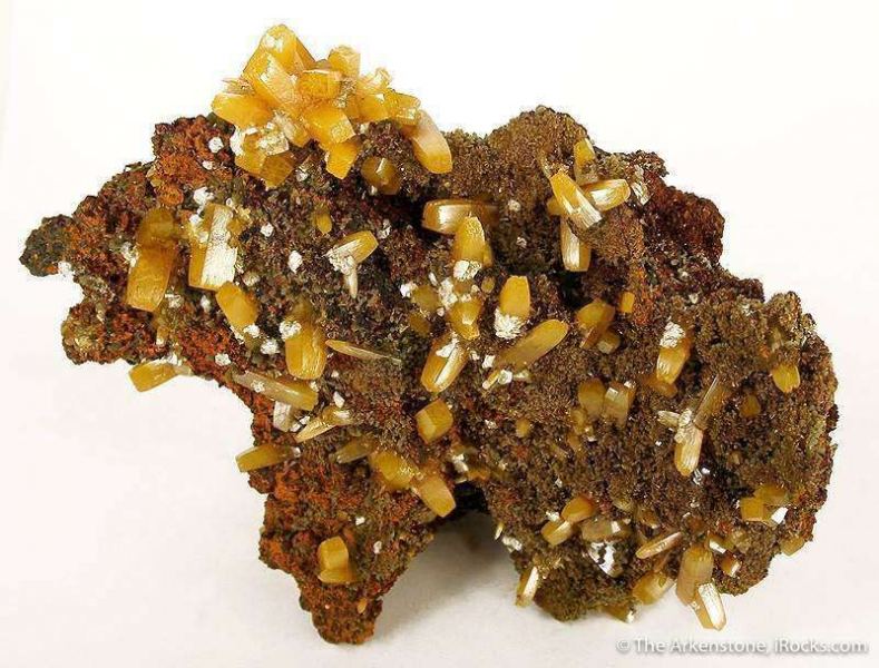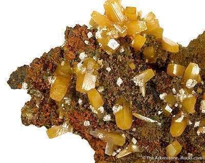 This is a Wulfenite With Calcite from San Juan Poniente Shaft, Ojuela Mine, Mapimi, Durango, Mexico. This plate of lustrous and translucent, butterscotch-colored crystals of wulfenite, to 1.0 cm in length, exhibit tapered, but blunt-capped tips.Data last checked on 29th Jul 2024 - specimen may no longer be available