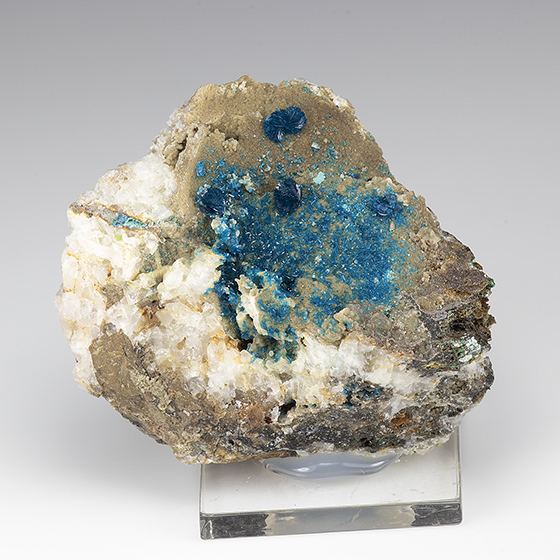 Deep blue sparkling crystal groupings of veszelyite to 0.4 cm in size on matrix with hemimorphite. Tiny and sparse micro-chipping present, overall I think in great condition. Excellent for this rare mineral. From recent finds in early 2021.Data last checked on 11th Aug 2021 - specimen may no longer be available