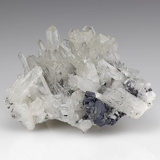 Semi lustrous twinned crystals of bournonite to 0.7 cm in size and a grouping along the lower right edge of this cluster of glassy gemmy quartz crystals. Naturally crystallized all around with very slight micro-chipping present, this in good condition. Tetrahedrite, sphalerite, and pyrite present as well. Bournonite is not very common from this closed locality.Data last checked on 11th Aug 2021 - specimen may no longer be available